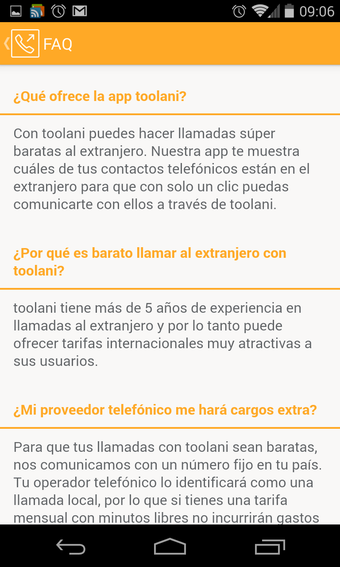 A diferencia de su servicio tradicional, la app de Toolani no requiere ninguna configuración extra. Una vez que la hayas instalado, en el momento de llamar a un contacto con número internacional, simulará la llamada a un "número local", con el consecuente ahorro en la llamada. Las tarifas son distintas según el país, por lo que recomendamos que les eches un vistazo antes de llamar (ten en cuenta también costes como el establecimiento de llamada).